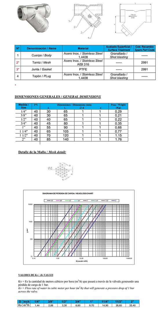 Filtros Tipo Y acero inoxidable roscado poseen un simple diseño y robusta construcción. Su gran área de filtrado implica que el mismo sea excepcionalmente eficiente. Sus partes internas son rápida y fácilmente accesibles. Los filtros tipo “Y” no solamente previenen el pasaje de material extraño, sino que constituyen un depósito donde éste es acumulado y luego fácilmente removido a través de su conexión de purga, la cual esta provista de un tapón roscado ó – a pedido se entregará-con una válvula para tal fin.