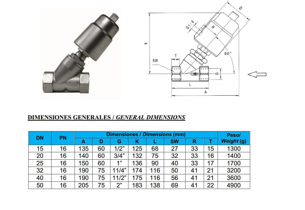 Válvula asiento inclinado con actuador neumático de simple efecto