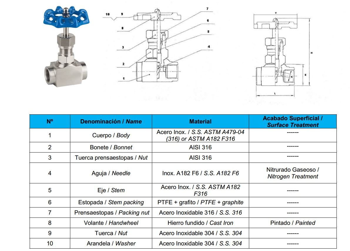 Construcción: acero inoxidable A182 F316/aguja inox A182 F316 + T. térmico. Rosca gas H-H. Estopada: PTFE. Presión máxima de trabajo 210 bar. Temperatura de trabajo: -20ºC a 250ºC.
