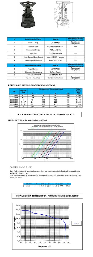 Válvula esclusa ASTM A105N Serie 800 NPT Const. cuerpo y bonete acero forjado ASTM A105N. Material de cierre: asiento con stellite. Compuerta: ASTM A182 – F6a. (trim #8/XU). Bonete atornillado. Extremos roscados