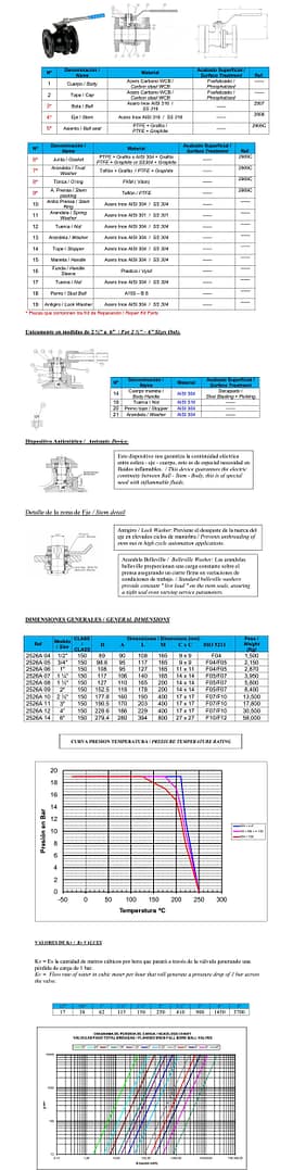 Válvula esférica 2 piezas Acero al carbono conexión bridada : Montaje directo de actuadores s/ISO 5211. Diseño fire safe. Dispositivo antiestático. Cuerpo: acero al carbono WCB (microfusión). Esfera y eje: AISI 316. Asientos: PTFE + 25 % Grafito. Tórica eje: vitón. Presión máx.: 19 kg/cm2. Temp. -30ºC +220ºC. Mando manual por palanca con sistema de bloqueo.