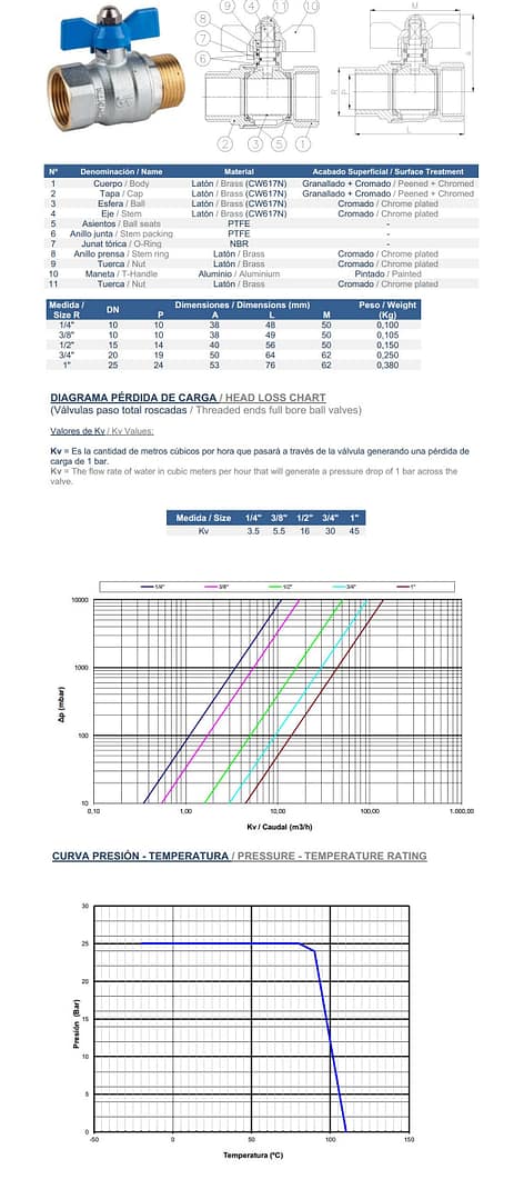 Válvula esférica mando tipo moño macho-hembra   PN 25. Paso total. Construcción en latón UNE-EN 12165 cromado. Asiento PTFE. Extremos rosca gas (BSP) M-H. ISO 228/1. Temp. máx. 110ºC. Mando manual por palomilla aluminio.