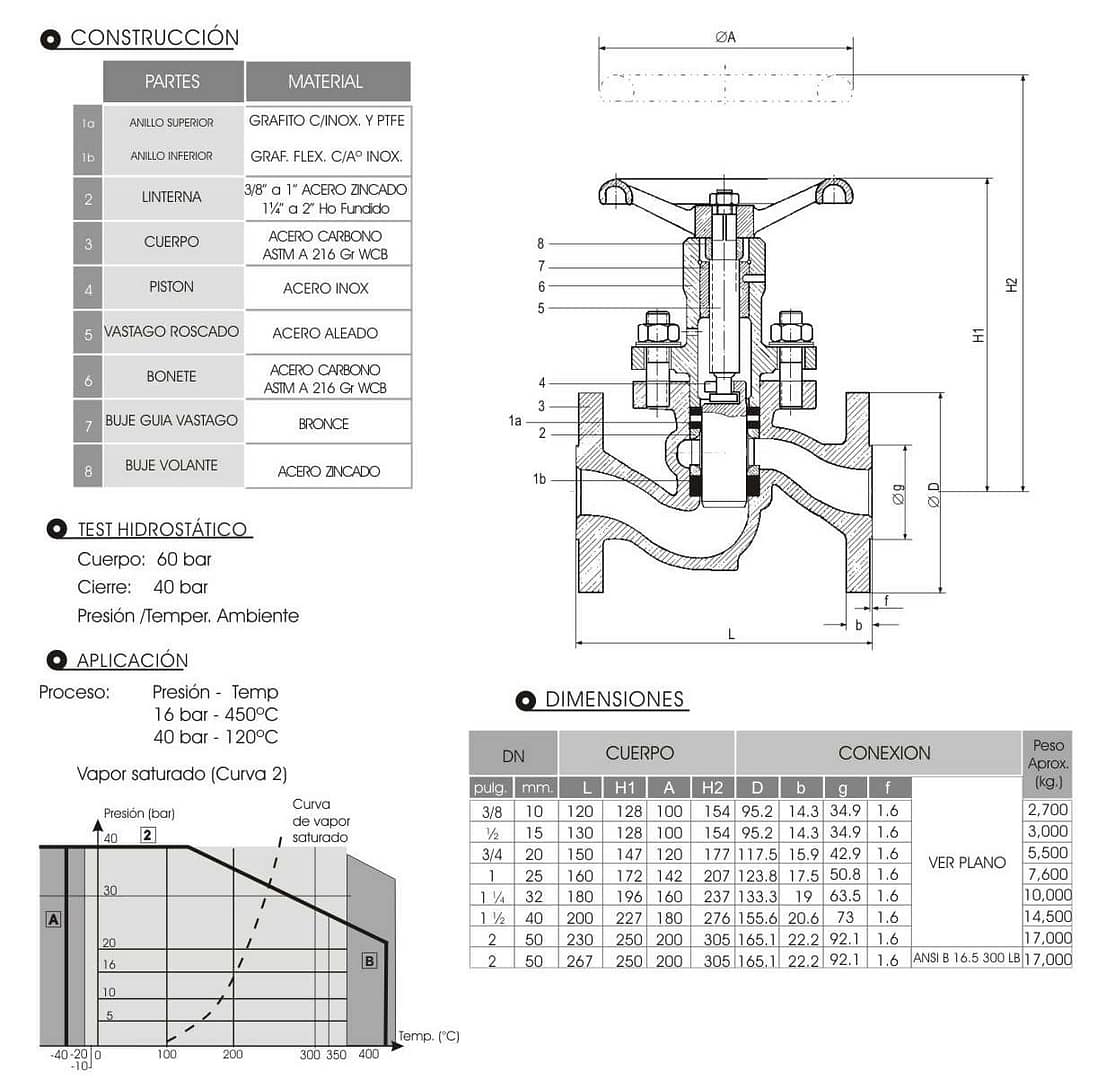 Válvula globo a pistón Acero al carbono conexión bridada  – Especificaciones técnica por medidas