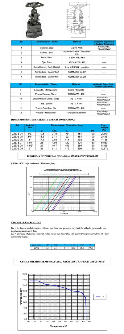Válvula globo ASTM A105N Serie 800 Conexión Bridada Const. cuerpo y bonete acero forjado ASTM A105N.